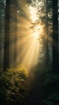 Serene Early Morning in Dense Pine Forest with Golden Light