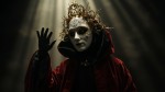 Mysterious Figure in White Ornate Mask and Renaissance Robe Raising Hand