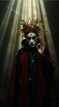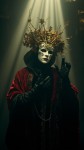 Create a mysterious masked figure wearing a white ornate mask with baroque engravings, adorned with a golden crown of flowers and branches, dressed in a Renaissance-inspired robe of deep red and black velvet. Dramatic lighting with divine rays piercing from above into the darkness, creating a theatrical and sacred atmosphere. The figure raises one hand gracefully, exuding mysticism, philosophy, and dark elegance. Highly detailed, cinematic, chiaroscuro, baroque fantasy style, ultra realistic.