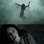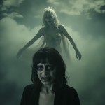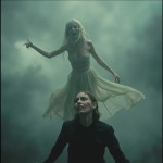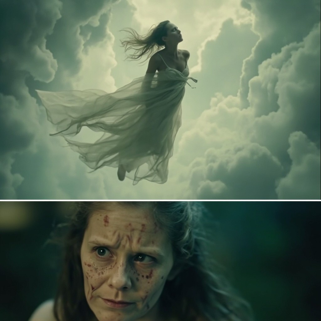 Mysterious Woman in Angelic Dress Sailing on Clouds with Sad Expression