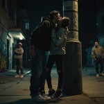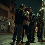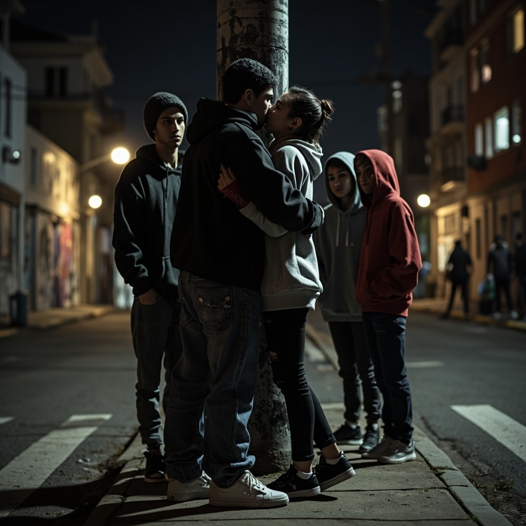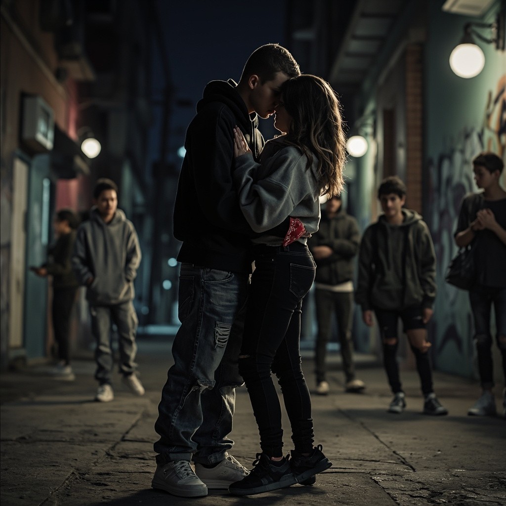Abrazados en la esquina del barrio con homies atrĂ¡s A young couple embracing on a street corner at night, the boy in a black hoodie, baggy jeans, white sneakers, red bandana on wrist, the girl in oversized gray hoodie, ripped black jeans, black sneakers, their friends hanging around in hoodies and sneakers, graffiti walls and dim streetlights, urban romantic and motivational vibe, realistic digital art, cinematic lighting, street style