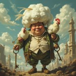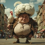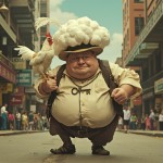 Fat Man with Crooked Legs, Chicken on Shoulder, Key Necklace and Marshmallow Hat in Glistophonia City