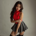 Make a full body amateur cell phone photo of a Panamanian Latina girl with white skin, glam makeup, red lipstick, black eyeliner on eyes, eye shadows in light and intense red tones, long straight shiny dark chocolate colored hair standing and posing. The girl is wearing a light red sleeveless tight turtleneck top, a grey unicolor gathered miniskirt, with black stockings and black heels.
