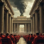 “Create a dramatic, realistic illustration of the papal conclave inside the Sistine Chapel on May 7, 2025. Show 133 cardinal electors dressed in red robes seated in solemn rows beneath Michelangelo’s famous ceiling. Outside, depict the Vatican chimney with black smoke rising into the cloudy Roman sky, signaling no pope has been chosen yet. Capture the atmosphere of suspense, reverence, and global anticipation, with crowds watching in St. Peter’s Square.