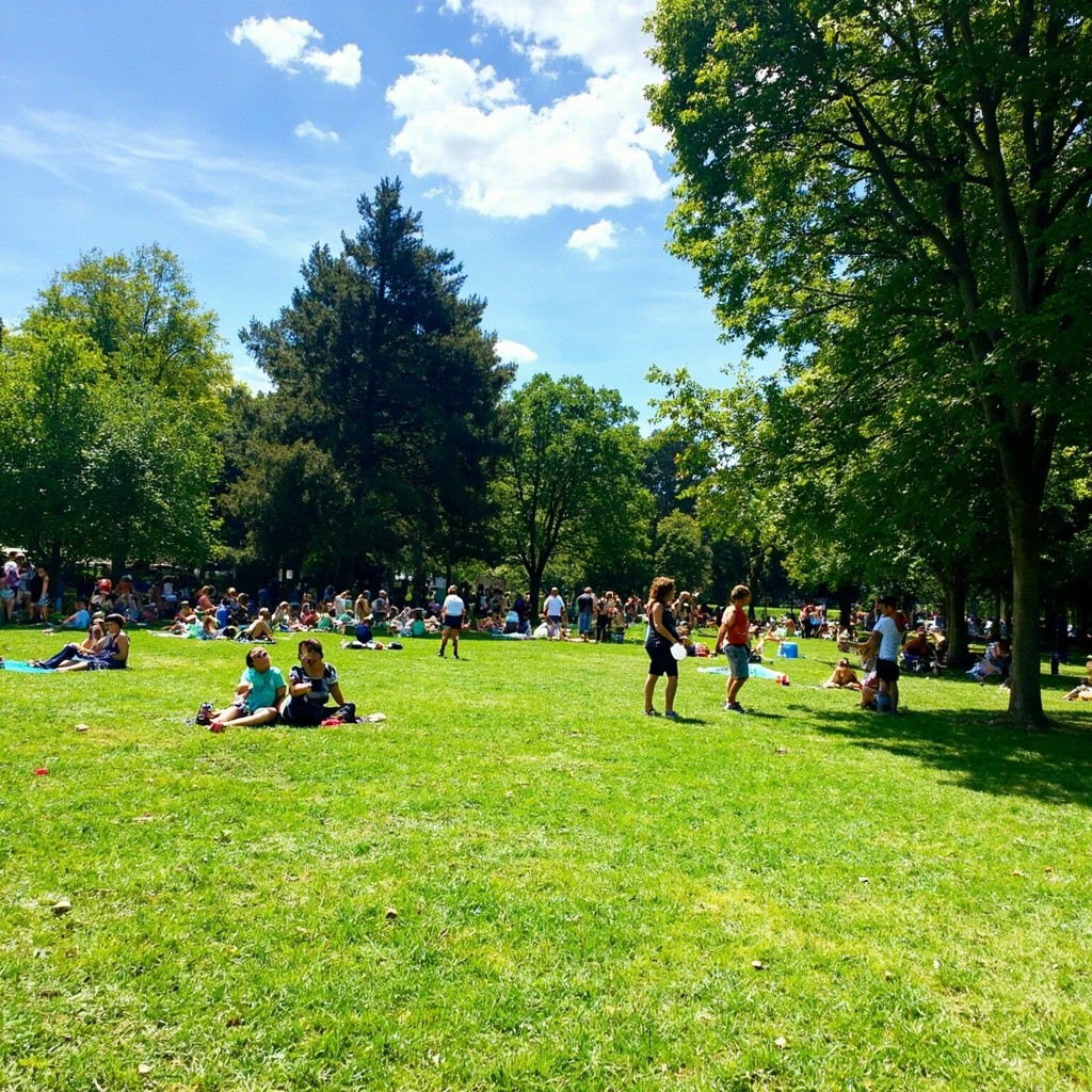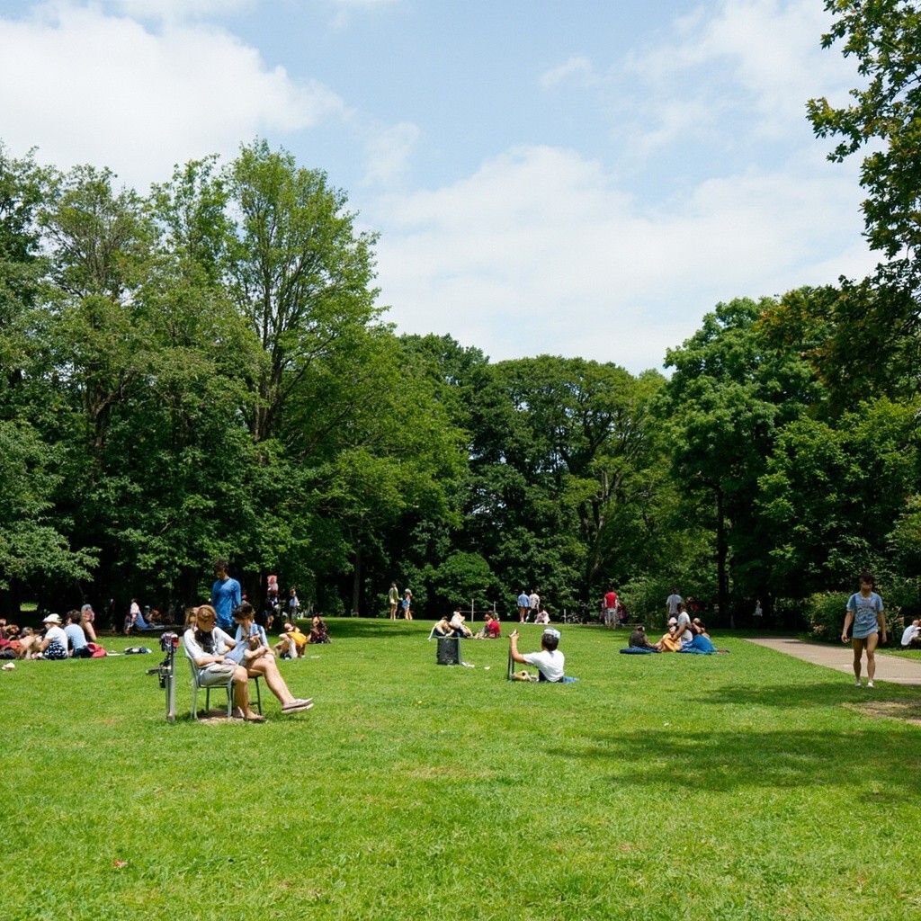 Grass Park with Trees and Diverse Picnicking and Walking People