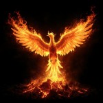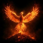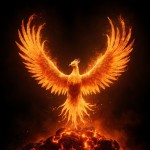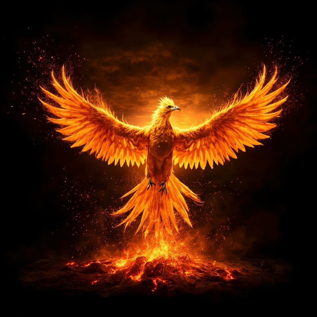 Phoenix Reborn from Lava at Sunrise with Fiery Wings on Black Background