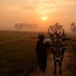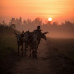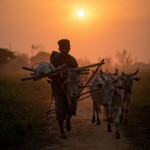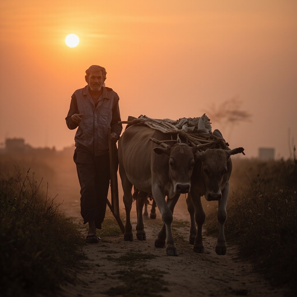 Poor Farmer Going to Field with Bulls at Sunrise