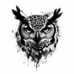 Black and White Ink Drawing of Octopus-Owl Hybrid Head Front View on White Minimalist Background