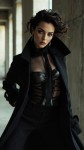 Editorial fashion shoot of a stunning woman with very dark brown loose curls, icy blue eyes, and full lips. She wears high-fashion designer clothing in black, charcoal, and silver tones — structured trench coats, sheer chiffon blouses, sculptural corsets. Set in a Brutalist concrete interior with soft natural light and floor-to-ceiling windows. Moody, minimal, powerful, Vogue-style photography. Wet hair in one shot, bold pose, intense expression, dramatic styling.