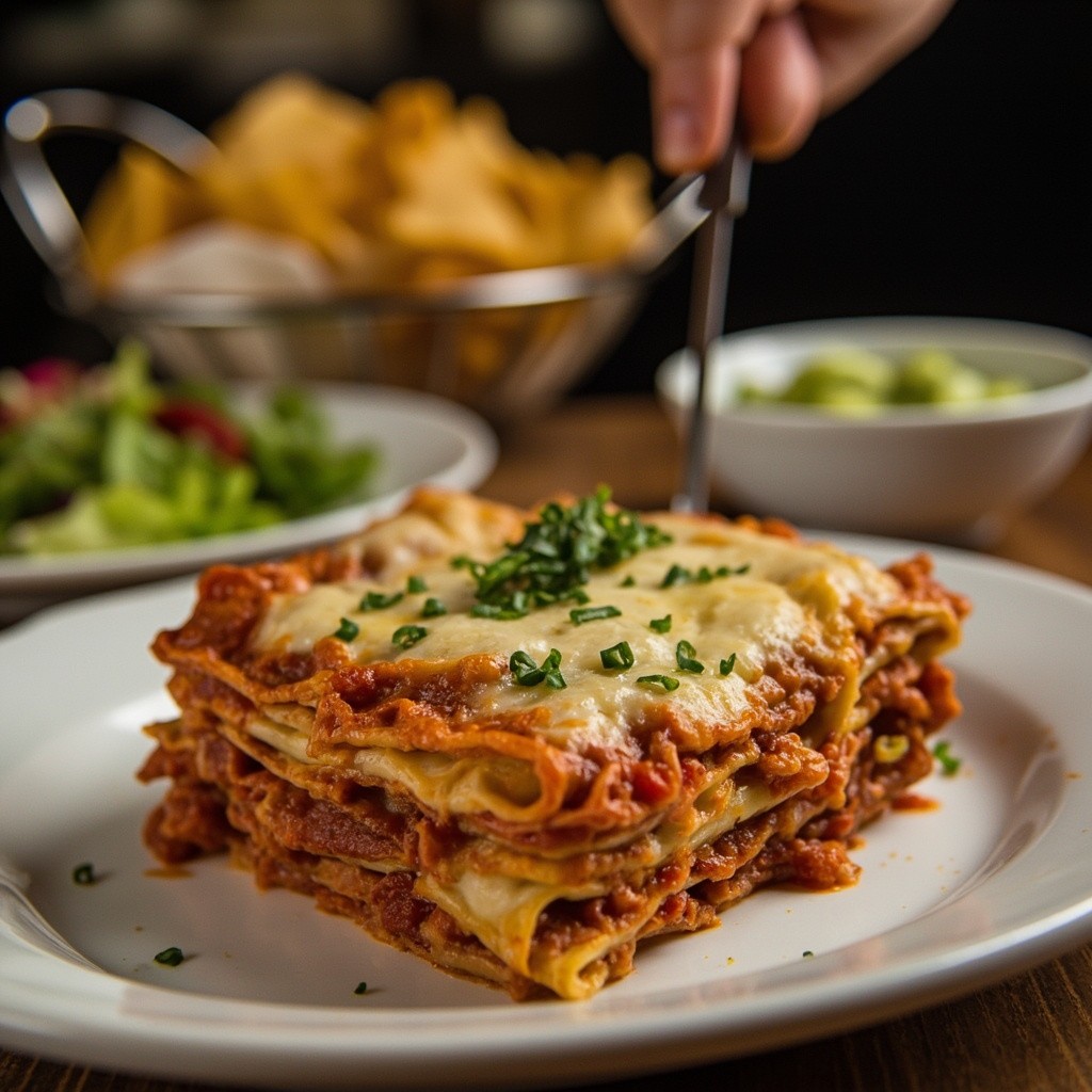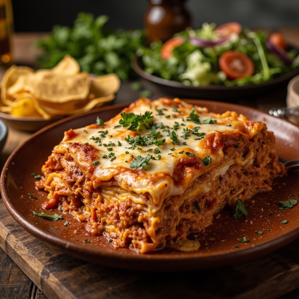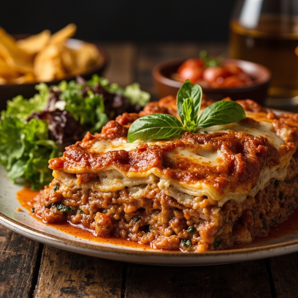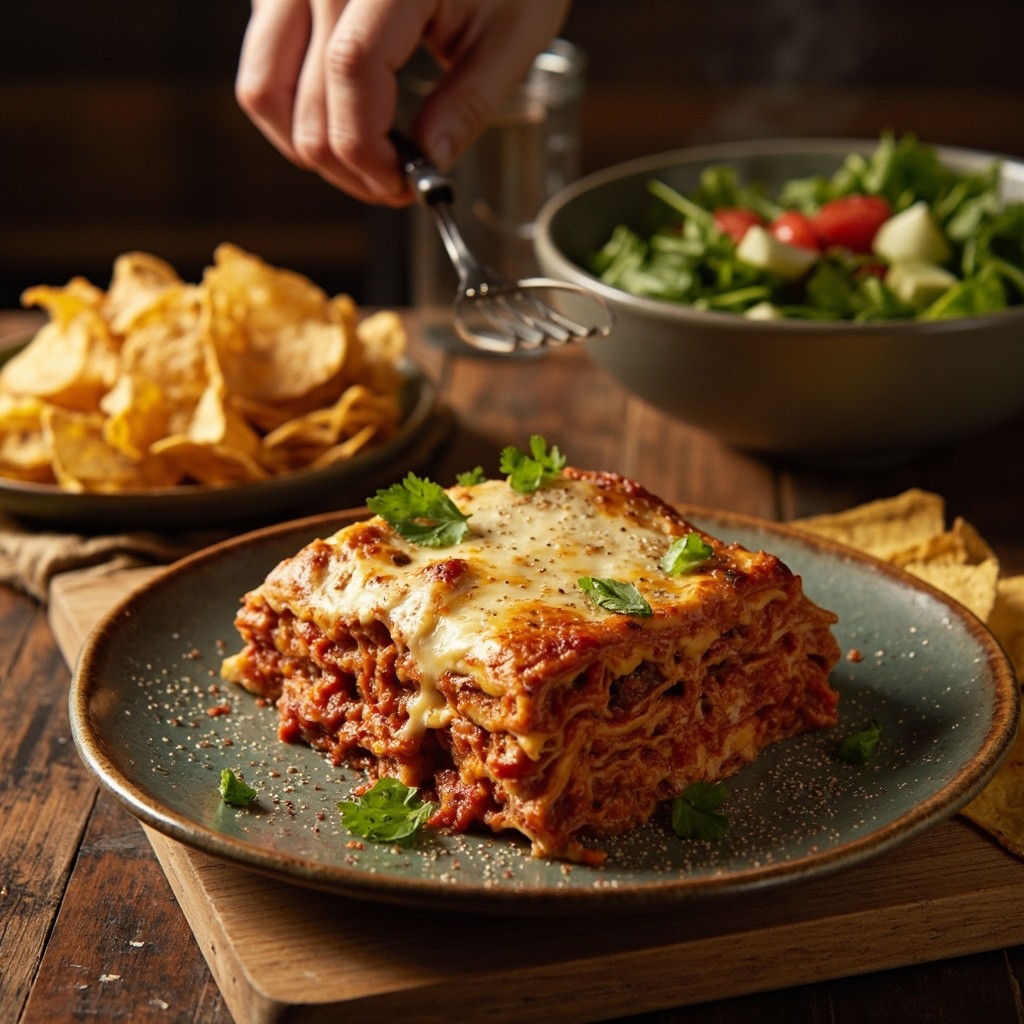 Preparing Homemade Lasagne with Salad and Chips