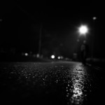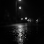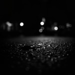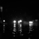 A quiet, moody night scene with gentle raindrops falling on a dark, wet surface. The background is deep black with soft, blurred bokeh lights faintly glowing in the distance. Each drop creates subtle ripples, barely illuminated by dim reflections. Captured in natural monochrome tones using a Canon EOS R5 with a 35mm f/1.8 lens, shallow depth of field, emphasizing texture, contrast, and atmospheric stillness.
