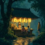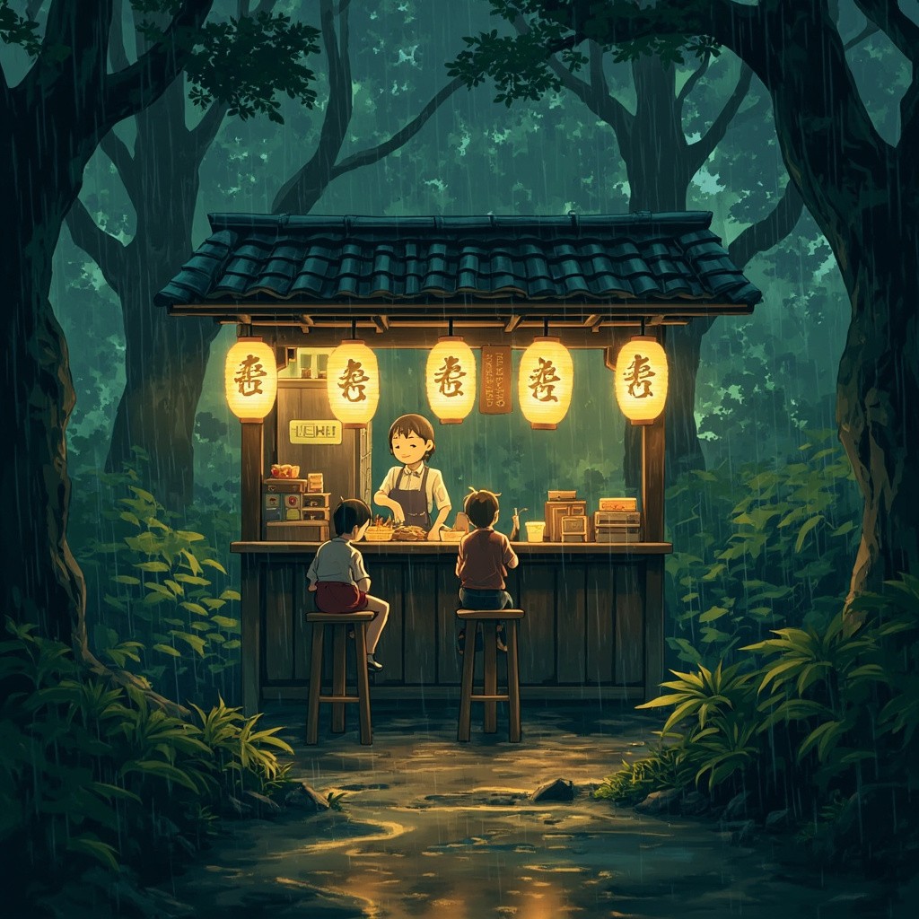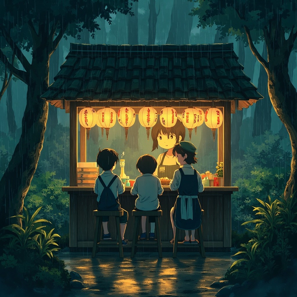 Anime-style rainy forest scene with a small cozy Japanese ramen food stall, soft warm light glowing from paper lanterns with Japanese characters, friendly female vendor in apron preparing food, two young boys sitting on wooden stools enjoying their meal, lush green foliage surrounding the stall, wet ground reflecting warm light, serene and nostalgic mood, cinematic composition, gentle rain falling, Studio Ghibli-inspired, highly detailed, illustrated in a painterly style