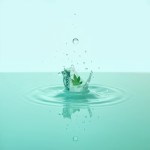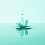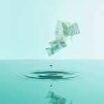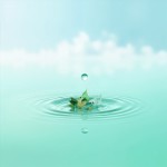 A perfectly still, shallow pool of water (pastel teal #AFDBD1) reflecting a clear sky. A single raindrop hits the surface—but instead of water, the ripple is made of translucent banknotes dissolving into leaves. Ultra-minimalist, hyper-realistic details, 98% negative space. Symbolizes 'customer transactions creating unseen environmental change.