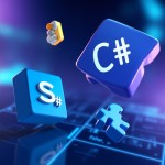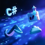 A futuristic tech background with soft blue and purple gradients, featuring floating 3D logos of C#, Visual Studio, Microsoft SQL Server (SSMS), Git, and GitHub. The logos appear to hover in mid-air with soft glows and motion blur effects, resembling a sci-fi digital workspace. Background elements include abstract circuits, code snippets, and digital clouds, evoking a modern programming and development environment.