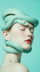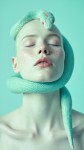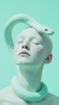 A surreal portrait of a serene, androgynous figure with pale porcelain skin covered in fine red freckles, eyes closed in a meditative expression. A pastel cyan snake with red eyes elegantly wraps around the figure’s neck and forehead, blending seamlessly into a soft aqua background. The composition is minimalistic with a futuristic, high-fashion editorial feel, soft shadows, and a dreamlike, hyper-detailed texture.