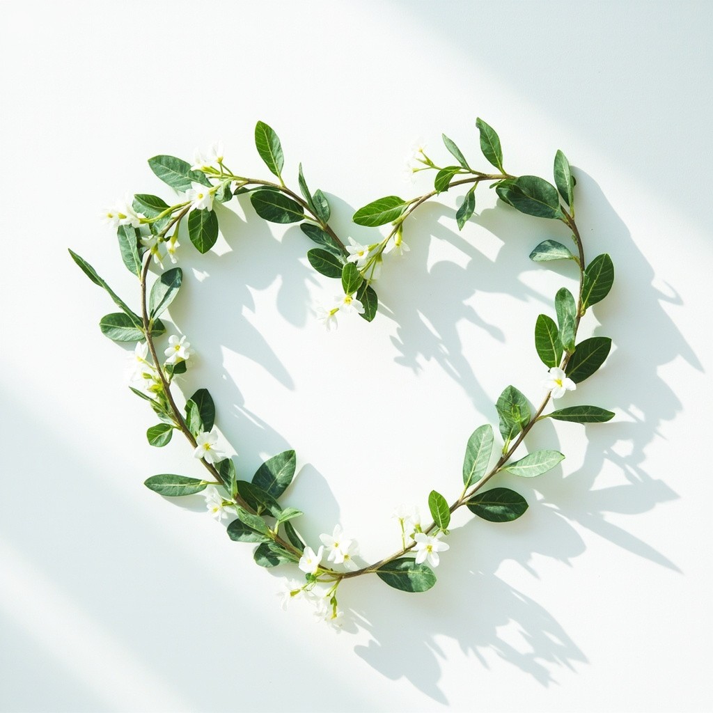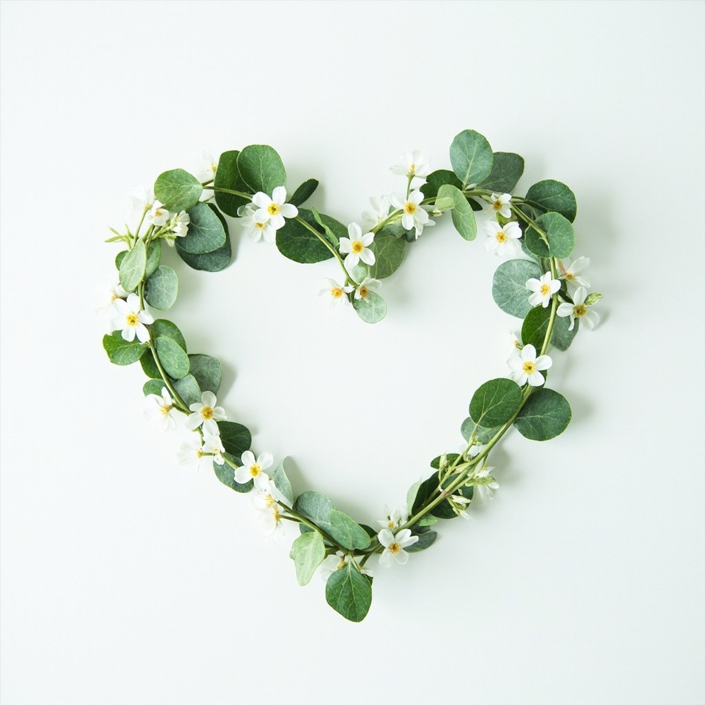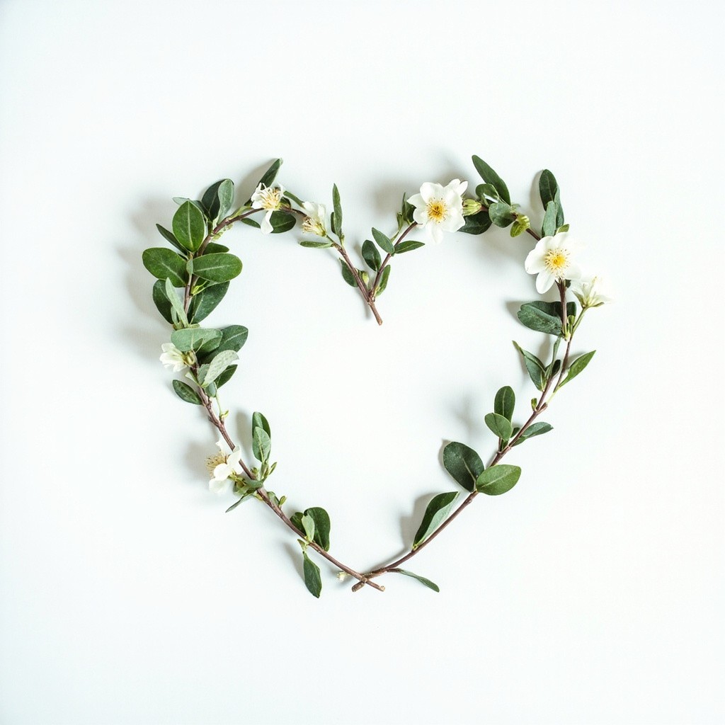 Minimalist Japanese aesthetic, a delicate heart shape artfully arranged with fresh organic herbs, eucalyptus leaves, and tiny white jasmine flowers on a clean white background. Soft natural morning light, airy composition, plenty of negative space for text, high quality photography, serene and calm atmosphere, zen vibes.