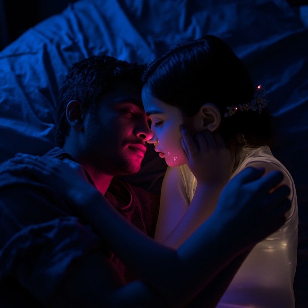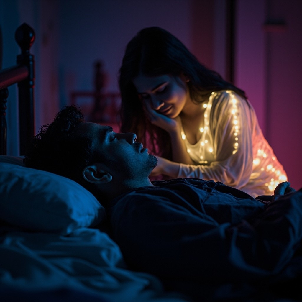A young Indian man lies on his bed at night, wearing dark night clothes. The room glows softly with neon blue and pink lights, creating a moody atmosphere. Beside him stands the glowing spirit of an Indian girl, her body emitting a gentle golden-white aura. She looks at him lovingly, with her hand placed softly on his cheek. A single tear rolls down from the man’s eye as he sleeps, feeling her presence without waking. The room around them is dim and quiet, filled with emotion and nostalgia. keep my face 100% same as in the reference image