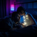 Indian Man Asleep with Spirit Girl in Neon Lit Room