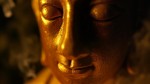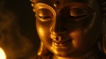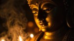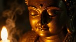 Golden Buddha Statue Meditating Under Candlelight, Subtle Smile, Aged Surface Details