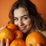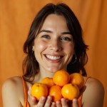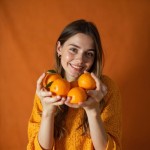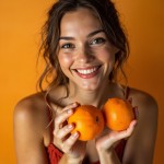 Smiling Russian Model Holding Oranges with Orange Shades, No Background