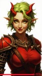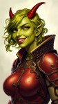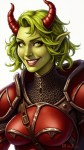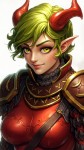 Tiefling Woman with Green Hair and Red Horns Smirking Illustration