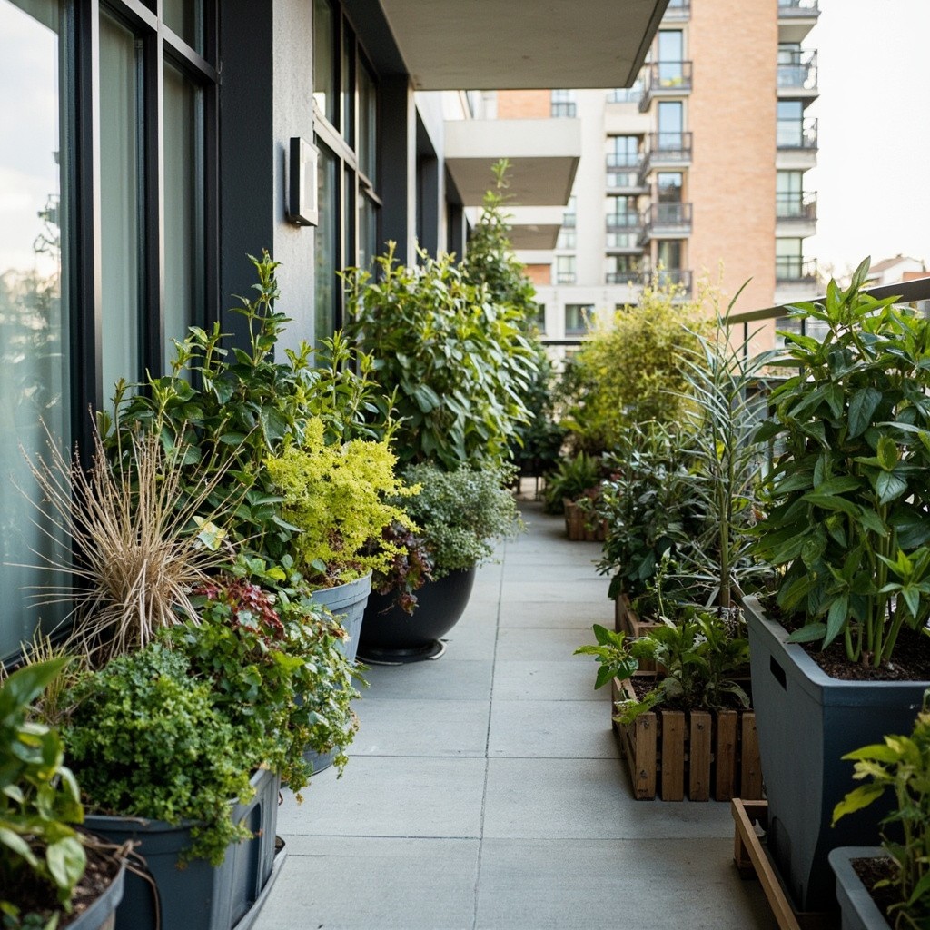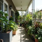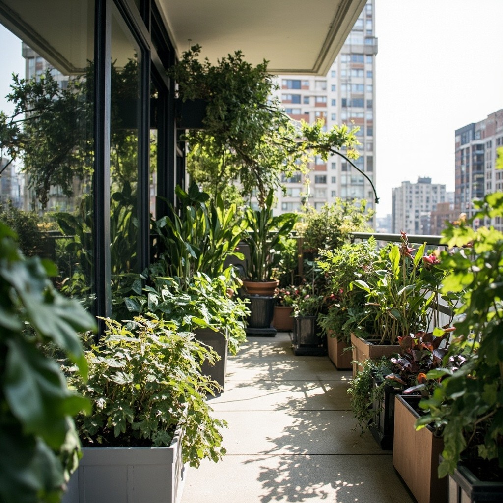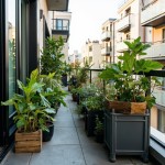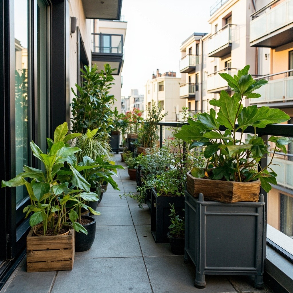 Contemporary Family Building Balcony with Well-Kept Plants in Grey Plastic and Wooden Pots