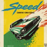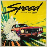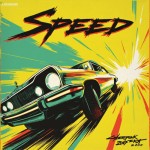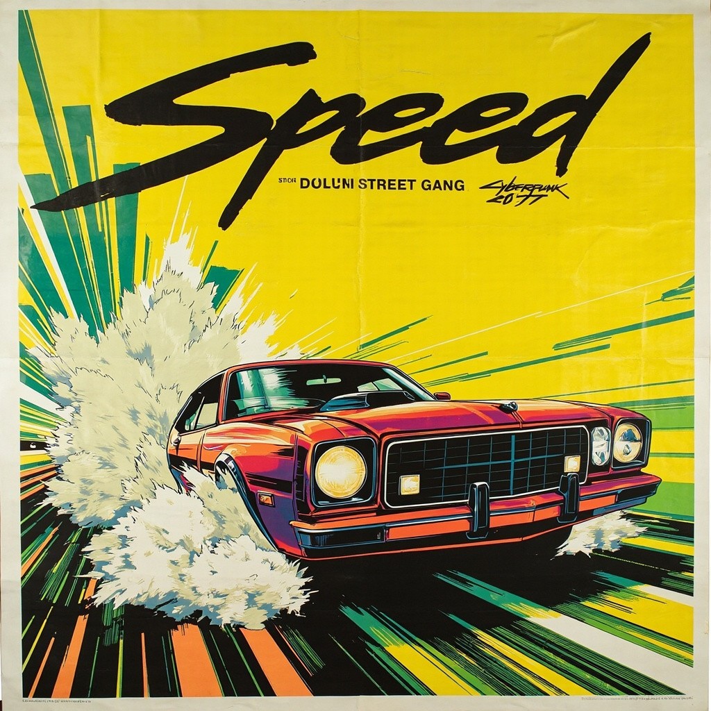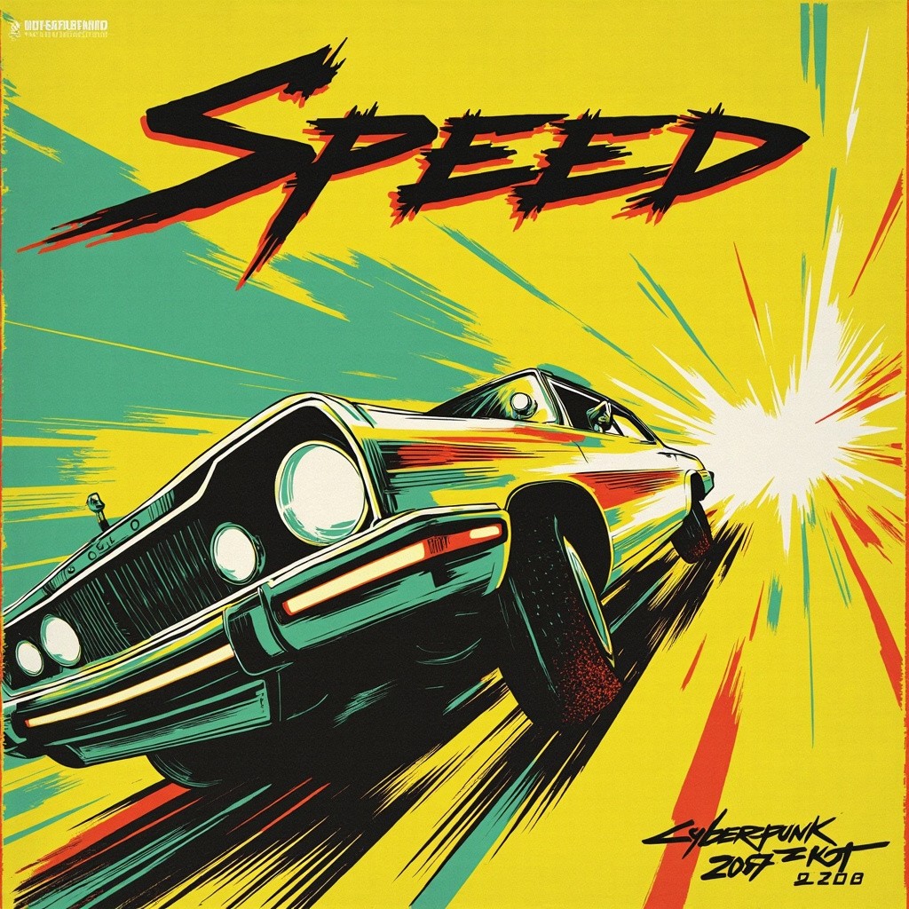 A paper poster, inspired by an 80s VHS box cover, with the word "Speed" printed in a bold modern font, shows the street gang elements of Cyberpunk 2077. A cartoon-style close-up of a speeding car rushing towards the camera, with a yellow and green background for a sharp contrast. Sharp lines and delicate textures are intertwined to enhance the depth and visual interest of the picture. This design is based on the game Cyberpunk 2077.