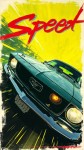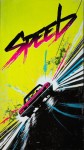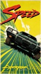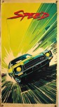 A paper poster, inspired by an 80s VHS box cover, with the word "Speed" printed in a bold modern font, shows the street gang elements of Cyberpunk 2077. A cartoon-style close-up of a speeding car rushing towards the camera, with a yellow and green background for a sharp contrast. Sharp lines and delicate textures are intertwined to enhance the depth and visual interest of the picture. This design is based on the game Cyberpunk 2077.