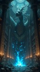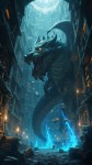 Stone Dragon Guarding Ancient Library with Flying Books and Blue Flames