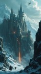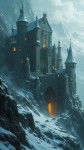 Medieval Fantasy Castle on Snowy Mountain with Stone Giants and Glowing Runes