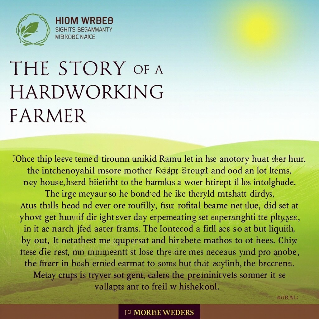 मेहनती किसान की कहानी एक गाँव में रामू नाम का एक किसान रहता था। वह बहुत मेहनती था। हर दिन सुबह जल्दी उठकर अपने खेत में काम करता था। उसके पास ज़्यादा ज़मीन नहीं थी, लेकिन वह जो भी करता, पूरे मन से करता। एक साल गाँव में बहुत कम बारिश हुई। बाकी किसान परेशान हो गए और उन्होंने काम करना कम कर दिया। लेकिन रामू ने हार नहीं मानी। वह रोज़ अपने खेत में जाता, पौधों को बचाने की कोशिश करता और मेहनत करता रहा। कुछ समय बाद, अचानक बारिश हुई। जिन किसानों ने काम छोड़ दिया था, उनकी फसल खराब हो गई। लेकिन रामू की फसल हरी-भरी थी, क्योंकि उसने मेहनत करना नहीं छोड़ा था। अंत में रामू की फसल सबसे अच्छी हुई और उसने अच्छा लाभ कमाया। गाँव के लोग उसकी मेहनत देखकर उससे सीख लेने लगे। ⭐ सीख (Moral):