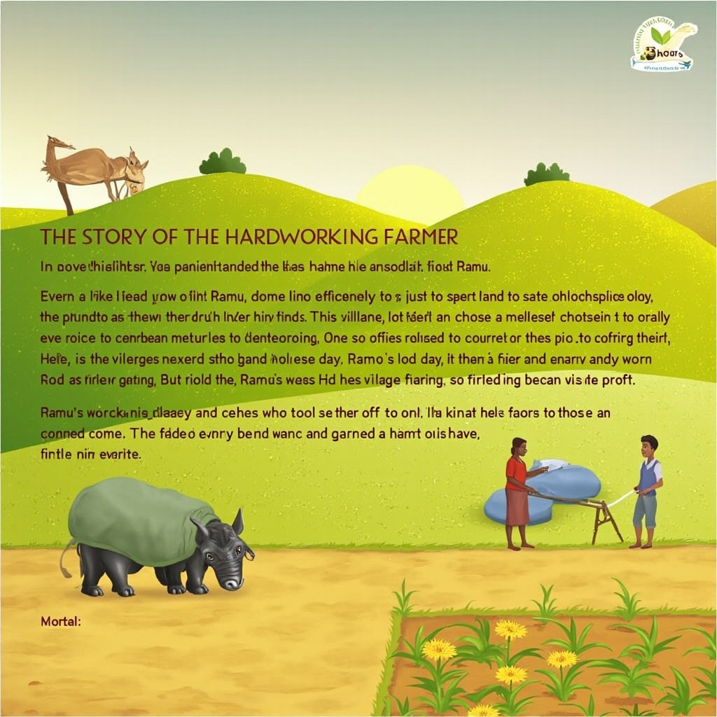 मेहनती किसान की कहानी एक गाँव में रामू नाम का एक किसान रहता था। वह बहुत मेहनती था। हर दिन सुबह जल्दी उठकर अपने खेत में काम करता था। उसके पास ज़्यादा ज़मीन नहीं थी, लेकिन वह जो भी करता, पूरे मन से करता। एक साल गाँव में बहुत कम बारिश हुई। बाकी किसान परेशान हो गए और उन्होंने काम करना कम कर दिया। लेकिन रामू ने हार नहीं मानी। वह रोज़ अपने खेत में जाता, पौधों को बचाने की कोशिश करता और मेहनत करता रहा। कुछ समय बाद, अचानक बारिश हुई। जिन किसानों ने काम छोड़ दिया था, उनकी फसल खराब हो गई। लेकिन रामू की फसल हरी-भरी थी, क्योंकि उसने मेहनत करना नहीं छोड़ा था। अंत में रामू की फसल सबसे अच्छी हुई और उसने अच्छा लाभ कमाया। गाँव के लोग उसकी मेहनत देखकर उससे सीख लेने लगे। ⭐ सीख (Moral):