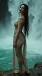 High-fashion editorial of a striking woman with very long, wet dark brown curls, vivid blue eyes, and full lips. She wears a sheer pale taupe dress, clinging to her body from the cyan water and accentuating her very large bust. Barefoot on wet stone beside a powerful waterfall, mist rising around her. Cinematic Vogue-style lighting, raw and elemental atmosphere. Strong pose. Ethereal, natural beauty — she looks like she belongs to the earth and water. Professional photography. Shot with Canon EOS R5. Sharp focus. Intricately detailed.