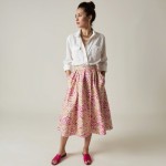 image a 40 year old highly stylish women with hair in a chignon. she is wearing a white pressed linen button down shirt with collar shown open and 3 chunky gold chains. sleeves are cuffed up to mid forearm. she is wearing a pink, white and tan geometric printed full skirt that is midi length and hot pink mules with closed toe but open back. hands are in pockets.
