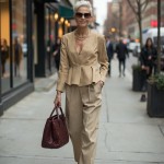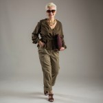 Stylish 40-Year-Old Woman in Khaki Trouser and Peplum Top with Gold Chains