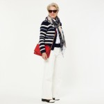 generate a 50 year old highly stylish women wearing white wide leg jeans, white ballet flats with black cap toe, a navy and white tightly fitted cardigan with a white tee shirt underneath and a printed scarf around her neck. gold earrings. add a red quilted bag on gold chain and she is wearing it across her body. she is standing. show full body shot.