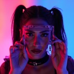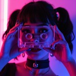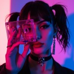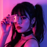 A photorealistic portrait of a stylish young woman with dark hair in twin ponytails, standing in front of a neon-lit wall glowing in vivid shades of pink, purple, and blue. She holds a transparent cassette tape in front of her face, aligning it perfectly with her eyes, creating a retro-futuristic visual effect. Her makeup is bold and polished, with dark eyeliner, voluminous lashes, and glossy red lips. She wears a black choker with a metallic emblem and matching earrings, adding a cyberpunk or synthwave aesthetic. Her fingernails are long and painted a glossy navy blue. The lighting creates high contrast and vibrant reflections on her skin and accessories, enhancing the 80s retro theme. High resolution, cinematic neon lighting, ultra-detailed textures, fashion editorial style, atmospheric and moody