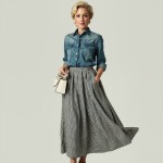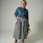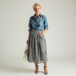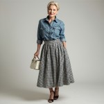 a forty year old woman with short blond hair and youthful face who is wearing make up and lipstick. she is wearing a fitted denim shirt that is unbuttoned with sleeves rolled up and a black and white full gingham skirt to reach below her ankles. skirt has deep pleats. she is carrring a small white purse wiht handles. one hand is in skirt pocket. handbag is a boxy shape. high heel sandals