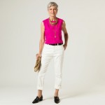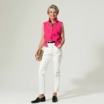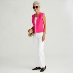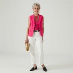 Create a 40-year-old woman with short gray hair and a pretty model's face. She is wearing a bright pink sleeveless waistcoat / vest. She is wearing white jeans that are fitted, pressed, and straight to ankle with black loafers. The jeans have an black belt. She is wearing a thick gold chain, a second thick gold chain close to neck and carrying a straw clutch. she is in a Studio setting with light background. No earrings.