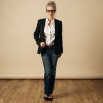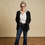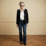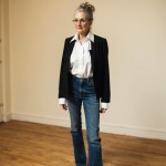 create a woman over 40 years old with gray hair in messy bun, make up. and oversized aviator glasses. she is wearing a white shirt with collar that is unbuttoned. she is wearing a black fitted blazer over the shirt. she is wearing fitted bootcut denim jeans and high heels. show her in studio with oak floor and cream walls. show a full body shot from head to toe.