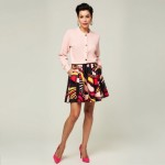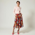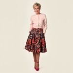 Imagine a 40-year-old highly stylish woman with modern hair styles, short. She is wearing a tight fitted short button from cardigan in light pink. She is wearing a full skirt with a bold RETRO print . Skirt hits at ankle length and hot pink 3" heels with a closed toe but open back. No ankle straps. Her hands are in her pockets. No earrings. show full body image.