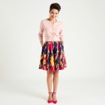 Stylish Woman in Retro Print Skirt and Pink Heels Full Body Image