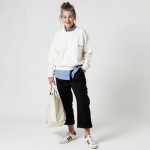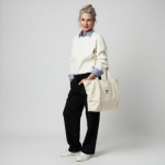 create an over 40 year old influencer with gray hair in a messy bun. She is fit, wearing red lipstick and pretty. she is in a studio setting wearing a crisp blue shirt under a white cotton crewneck pull over sweater over black adidas track pants with straight wide leg and white Adidas Samba sneakers and a LLBean canvas boat tote.