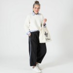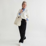 Fit Older Influencer with Gray Bun, Blue Shirt, White Sweater, Black Track Pants in Studio
