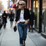 Chanel-Inspired Black Tweed Jacket on Fashionable 40-Year-Old Woman in Street Scene
