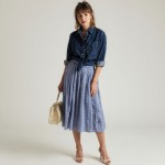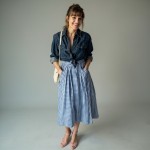 a forty year old woman with light brown straight hair, bangs and messy pony tail and youthful face who is wearing make up and lipstick. she is wearing a fitted dark denim shirt unbuttoned and tucked into skirt. sleeves rolled up and a blue and white full gingham skirt to reach below her ankles. skirt has deep pleats. she is carrring a small white straw purse with handles pale pink high heel sandals.