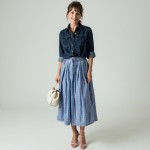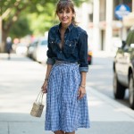 Stylish Woman with Ponytail in Denim Shirt and Gingham Skirt