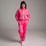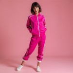Imagine a 40-year-old woman who is highly stylish and very pretty. Hair is in an Anna Wintour bob to cheekbones with bangs. She is wearing makeup and lipstick. She is in a hot pink track suit with white piping down leg of pant as and jacket trim down the sleeve. zipper on jacket is white. She is wearing white track sneakers.