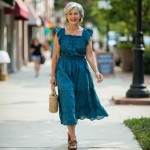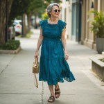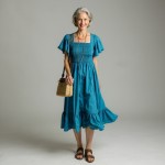Stylish 40-Year-Old Woman with Gray Bob in Teal Midi Dress and Raffia Sandals