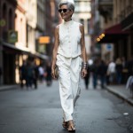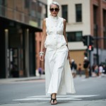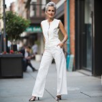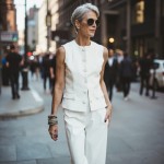 Imagine a 40-year-old woman who is highly stylish and very pretty. Hair is short silver gray and stylish. She is wearing a long fitted jewel neck white vest, no collar, in white with buttons. she is size 8. She is wearing matching white wide-leg long trousers in the same fabric and black dressy thong high-heeled sandals. Two silver bangle bracelets. Put her in an urban setting